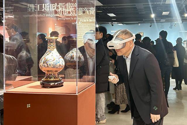 走进人大艺术学院展厅,融合静态陈列、动态展演与创新设计的展陈令人耳目一新,非物质文化遗产多模态数字资产建设知识工程成果展示区人气正旺。不少观众戴上虚拟现实(VR)设备,“穿越”进入非遗技艺的原生空间。透过视窗,不仅能将展品的材质、细节看得一清二楚,更能沉浸式观察传承人的形态、动作、语音及工作环境。“我看到了匠人们在制胎、掐丝、拓图等步骤中的细致操作,最终制作成精美的景泰蓝花瓶,有一种身临其境的感觉。”观众于女士说,戴上另一种增强现实(AR)眼镜,还可以通过眼神的停留聚焦,切换不同的技艺和观察视角。