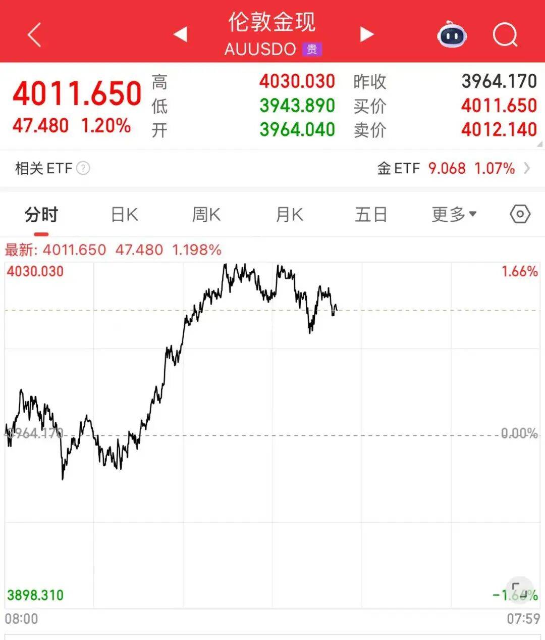 10月29日, 伦敦现货黄金重新站上4000美元/盎司关口,一度冲高至4011美元/盎司。