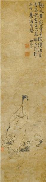 徐渭自号“天池山人”。这幅作品从气势看,给人一种醍醐灌顶的感觉。徐渭并没有按照程式化装束和规范刻画观音宝相,但从女子饱满的面部,能看出一种佛性。除了《莲舟观音图》,徐渭还有《渡海观音图》,题文写道:“海大鱼,观音居。波涛拍空身容与。童子不来蟹公俱,付人供养福有余。田水月”。画面上观音双手拢袖,脚踏鲤鱼渡江。传统的渡海观音图中与观音在一起的是善财童子,徐渭用蟹来代替。但在画面上,并没有找到蟹。蟹,也被称为“无肠公子”。无肠是“无偿”还是没有忧愁?善财童子是招财还是追求真理?看似荒诞,但仔细想想其中寓意百转千回。