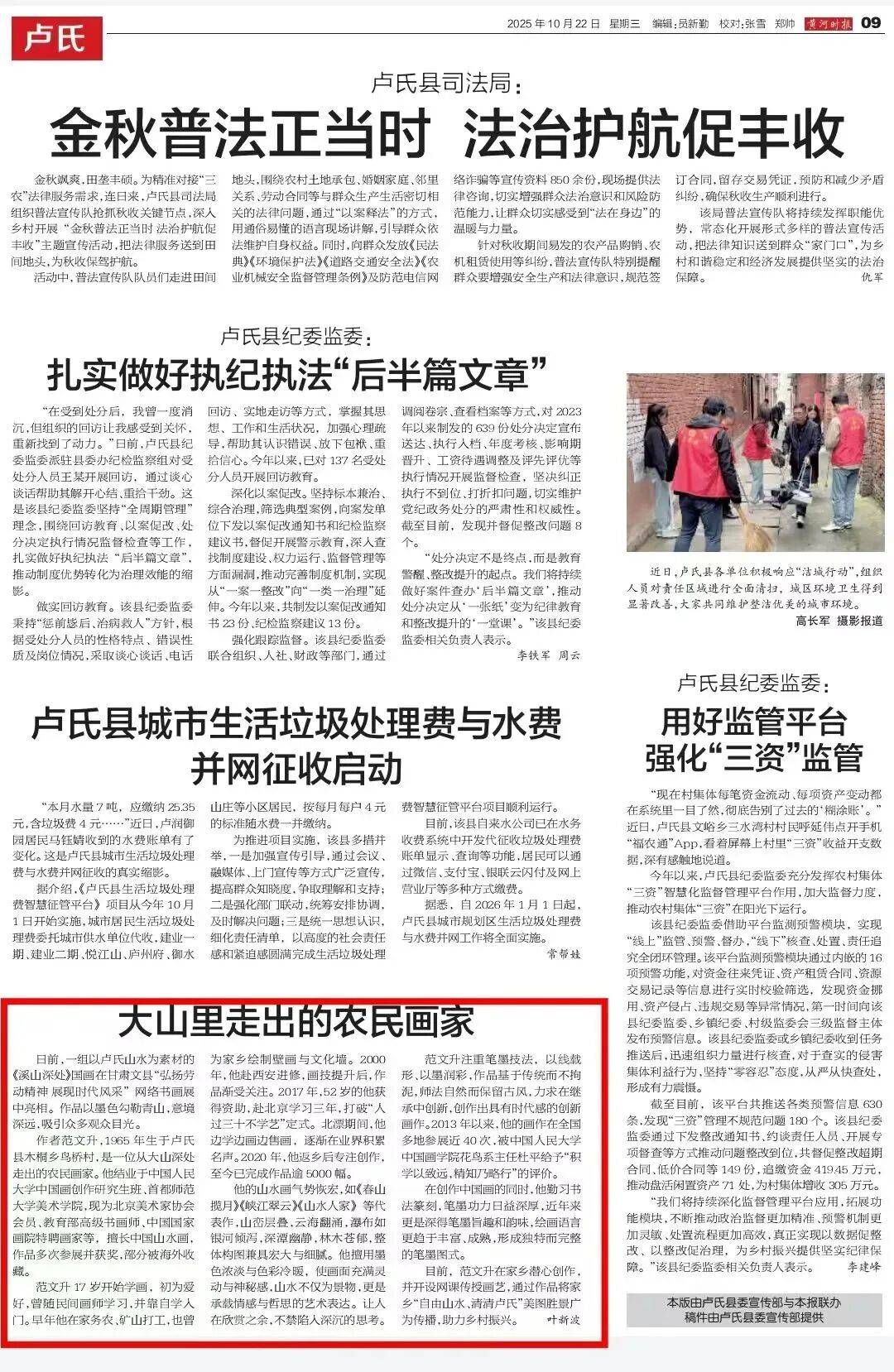 目前,范文升在家乡潜心创作,并开设网课传授画艺,通过作品将家乡“自由山水、清清卢氏”美图胜景广为传播,助力乡村振兴。