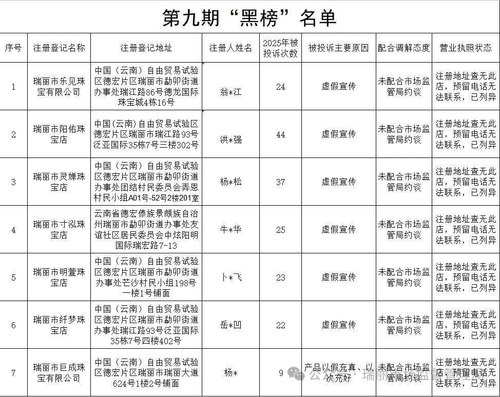 为加强珠宝翡翠直播乱象治理力度,有效规范珠宝翡翠直播行为,维护诚信经营秩序,切实保护消费者权益,近期,瑞丽市市场监督管理局对翡翠直播引发的消费投诉进行梳理,对被投诉次数较高的商家开展约谈提醒,并对部分未配合解决投诉态度恶劣或通过注册地址和联系电话无法取得联系的商家以“黑榜”形式进行公示。
