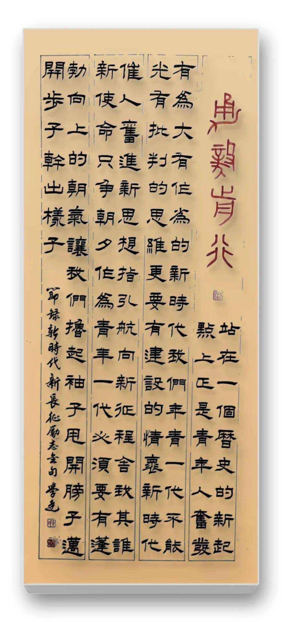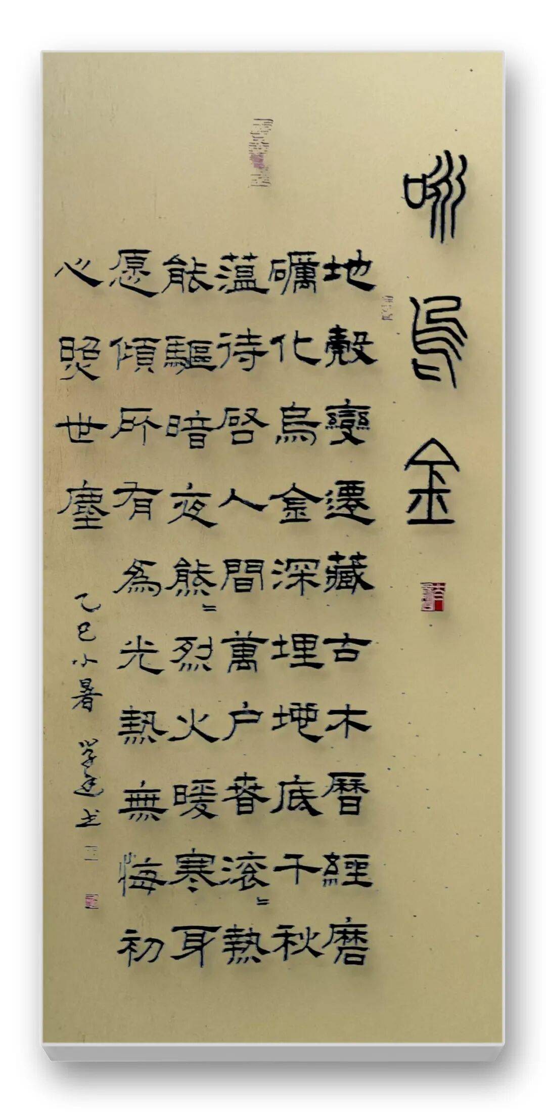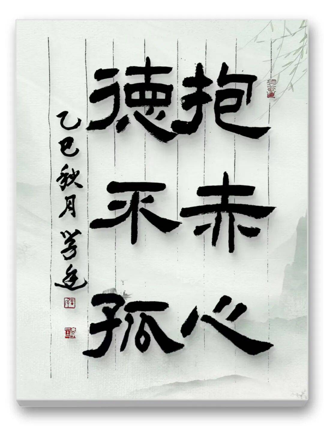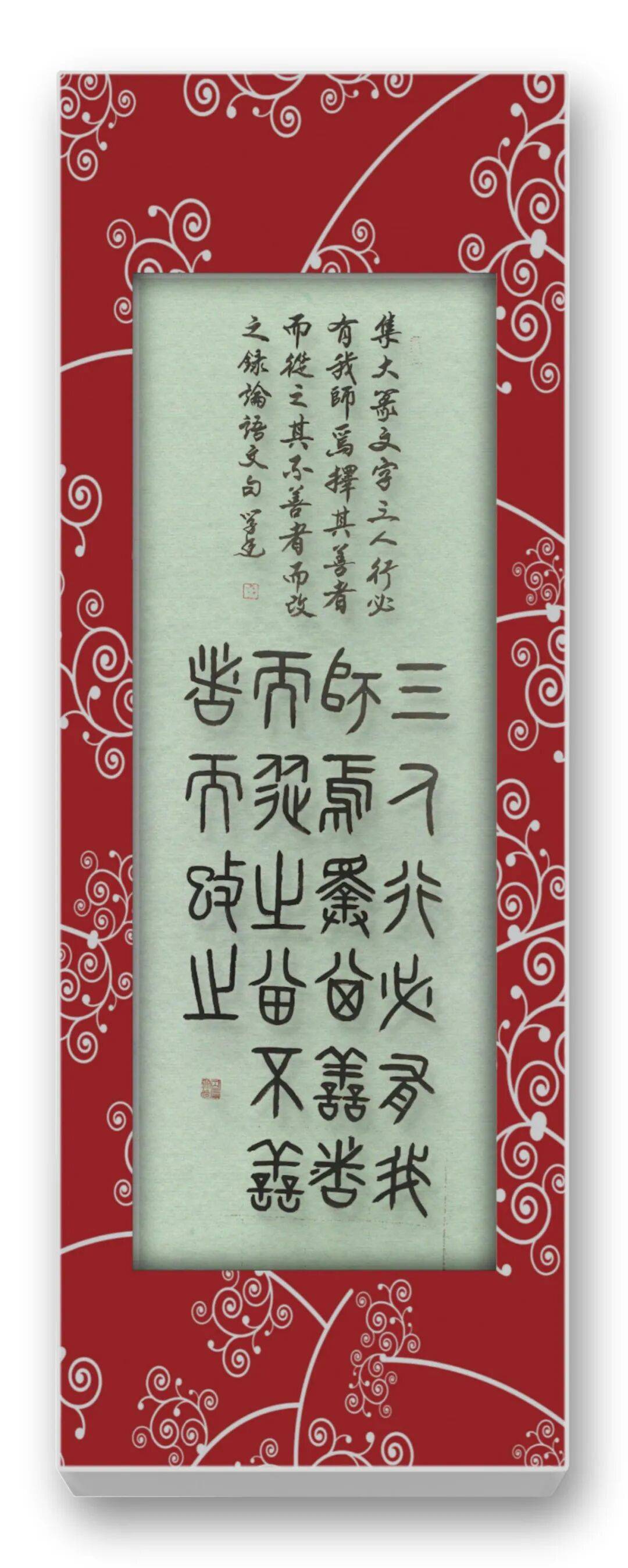 王学廷老师的书法创作,呈现出多元并举的探索格局。他不局限于某一单一书体或风格,而是在篆、隶、楷、行的疆域里自由驰骋,且在每种书体的创作中都形成了鲜明的个人面貌。篆书作品取法金文的浑穆与小篆的规整,线条凝练如铁,结体奇崛多变,将“士不可不弘毅,任重而道远”的儒家精神,通过篆书的庄严气象予以视觉化表达,让古老的书体在当代焕发出思想的锋芒。