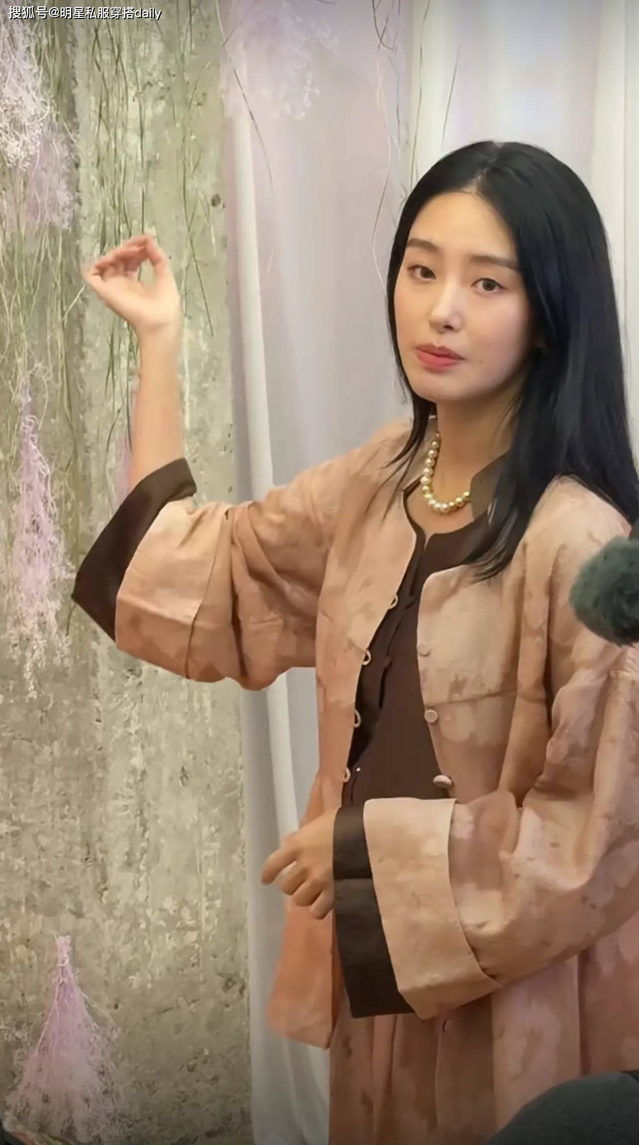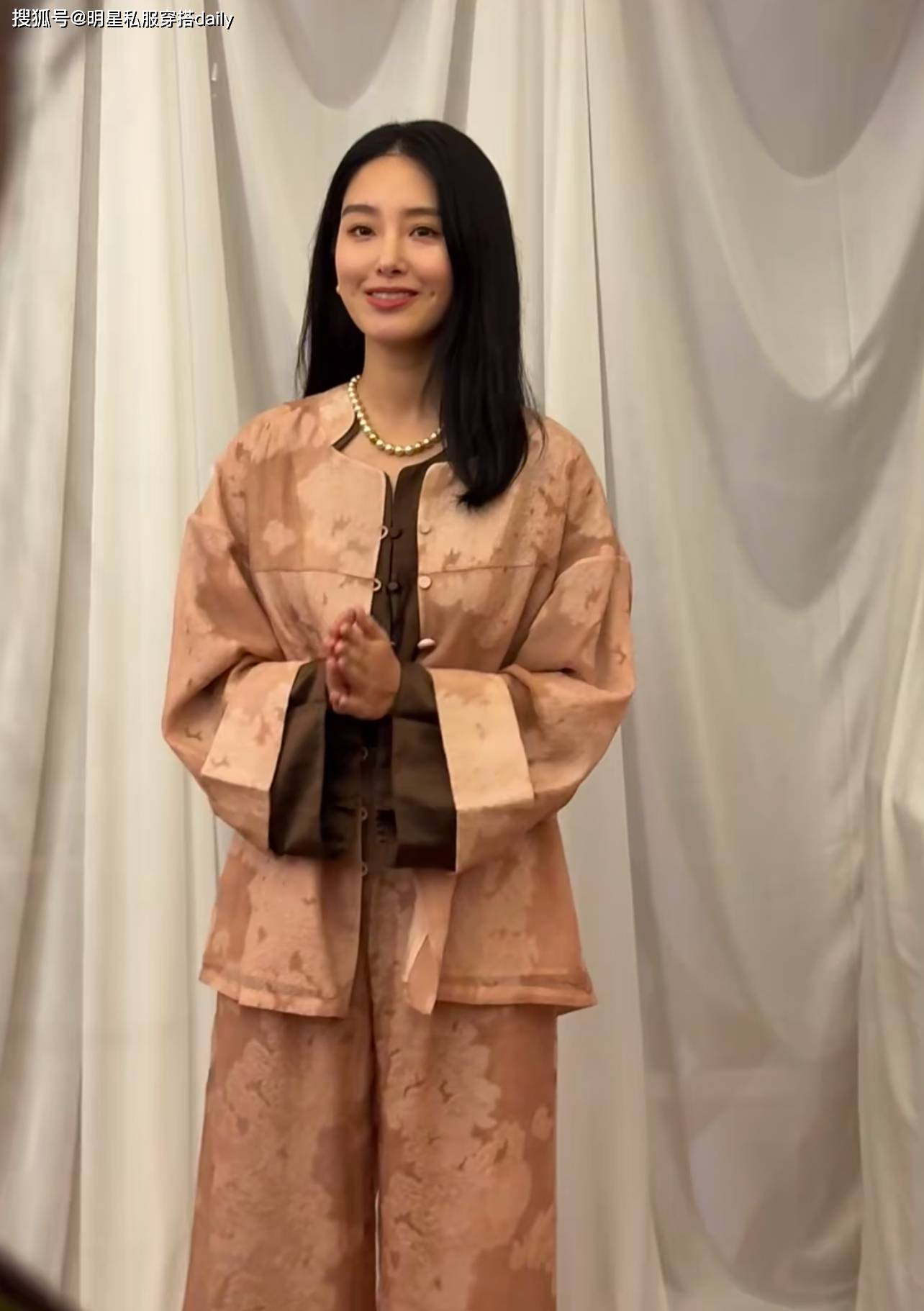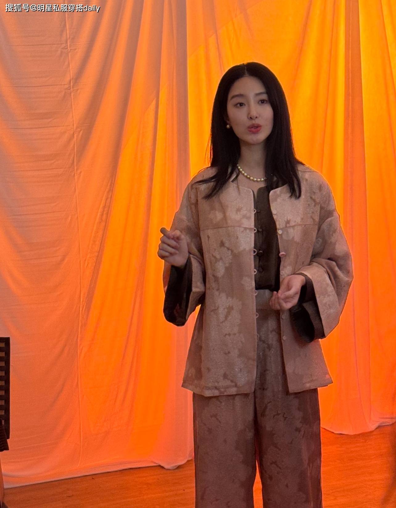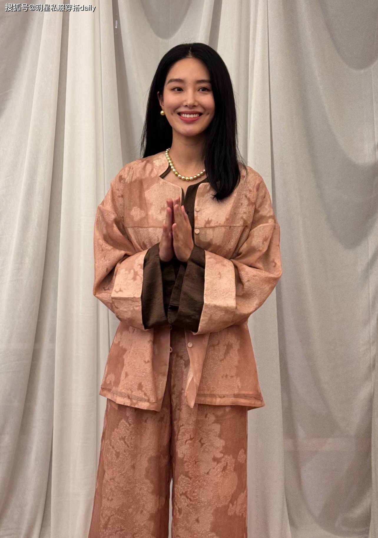 同色系的搭配不仅让造型更显和谐统一,还能在视觉上拉长身形 —— 绯色从上衣延伸至下装,形成纵向视觉线条,让杨采钰的身形看起来更显修长挺拔。这种 “上下同色 + 宽松版型” 的组合,既符合新中式风格的 “雅致” 定位,又能包容不同身材,展现出 “不刻意追求显瘦,却自然显气质” 的穿搭智慧,很适合当妈后追求舒适与优雅并存的女性借鉴。