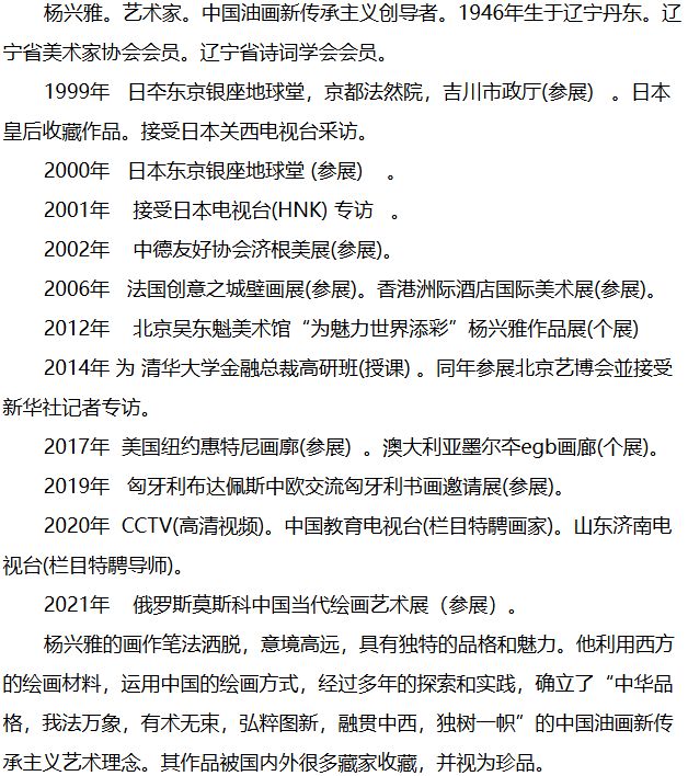 造型是杨兴雅先生油画的底基,油画无论如何传承,如果失了形态,必然就是失了根源。所以他的油画是专业造型的精湛范式,无论是山水风景还是人物都是形态的致美。真实可观,是最好的艺术的表现力,这是他的功法底气。如果说以前的油画家,试图让油画影响中国画,那么当下的杨兴雅则是开启了让中国画影响油画的新征程。用中国画的意象气韵去影响油画的创作,把油画失序的印象主义,更正为中国画审美有韵的意象之美,可看可悟,动心悦目,从结果的塑造来看绝对成功!