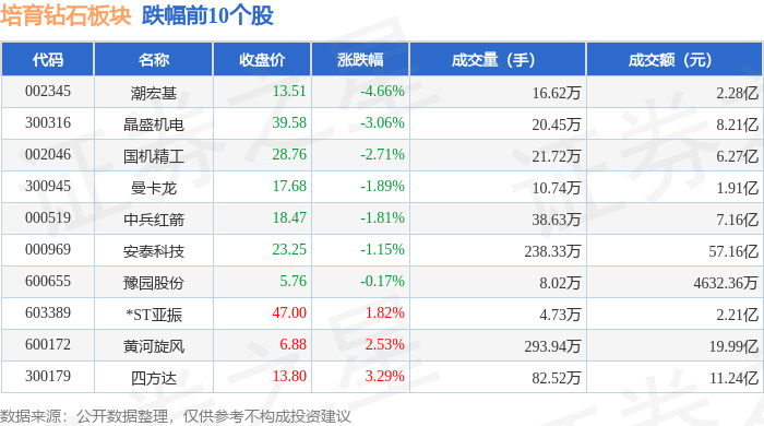 证券之星消息,10月30日培育钻石板块较上一交易日下跌0.38%,潮宏基领跌。当日上证指数报收于3986.9,下跌0.73%。深证成指报收于13532.13,下跌1.16%。培育钻石板块个股涨跌见下表:
