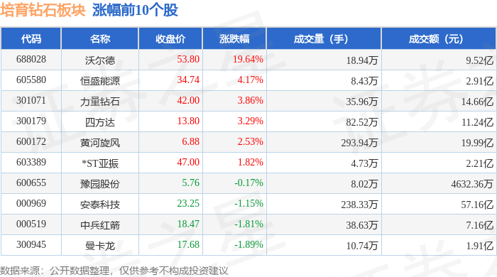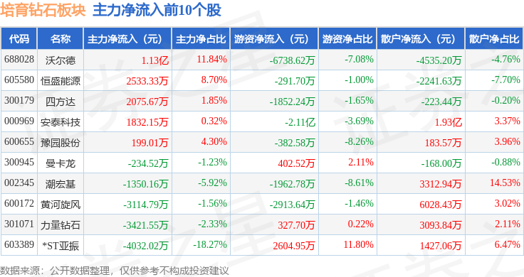从资金流向上来看,当日培育钻石板块主力资金净流出1.9亿元,游资资金净流出2.63亿元,散户资金净流入4.53亿元。培育钻石板块个股资金流向见下表: