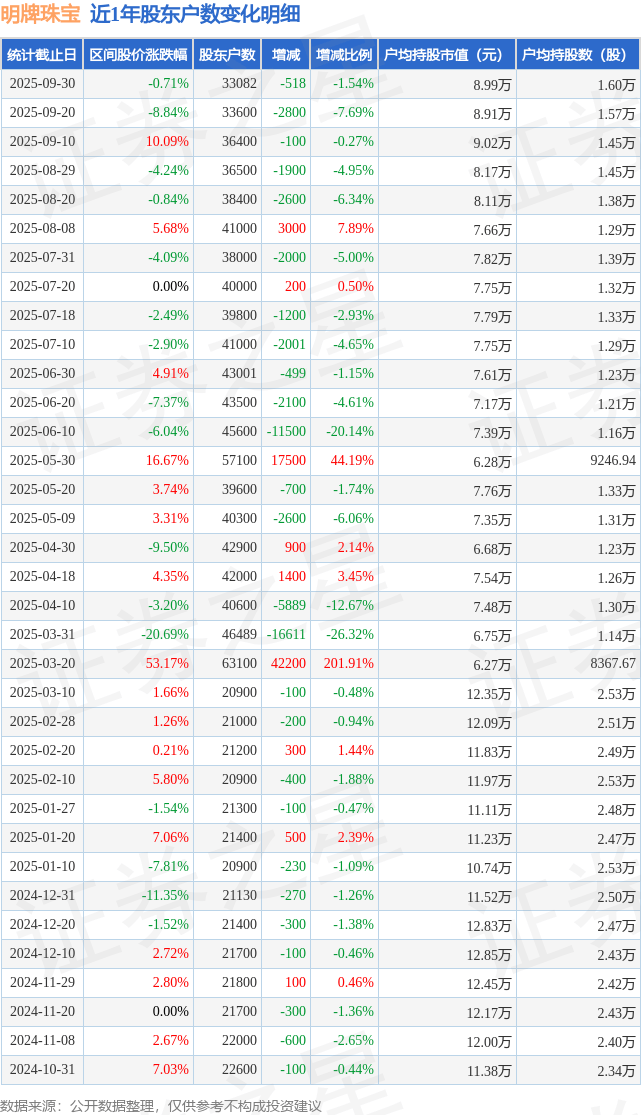 从股价来看,2025年9月20日至2025年9月30日,明牌珠宝区间跌幅为0.71%,在此期间股东户数减少518.0户,减幅为1.54%。
