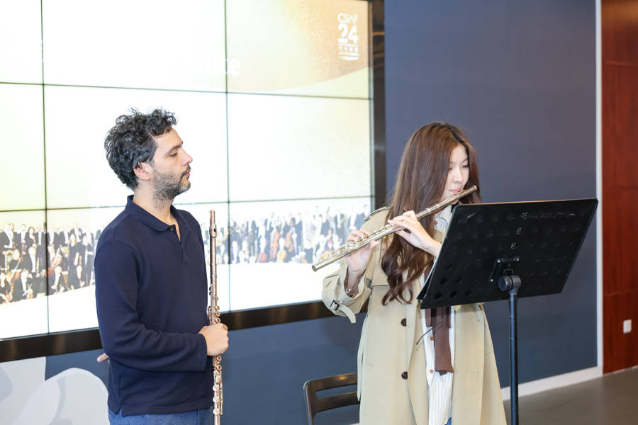 宇蕊用长笛吹奏了极具意境的中国作品《渔舟唱晚》,别致的东方韵味和中国式浪漫让人沉醉。长笛演奏家詹卢卡·坎波同样提出了要把乐声送出去这一建议。从围绕气息控制、弓速均匀度到口型与音准配合等细节,大师和学子同台,悉心地逐一点拨,让学生受益匪浅。