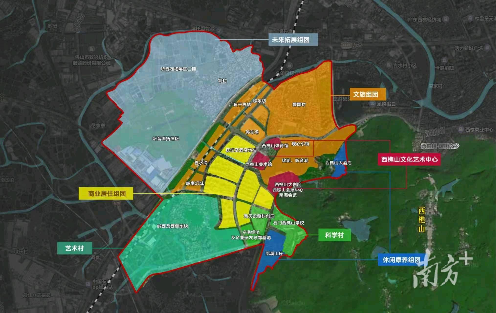 西樵山科学艺术小镇是西樵镇重点打造项目。据规划,小镇面积近7300亩,旨在为推动科学家、艺术家、企业家及青年人的跨界融合创新搭建平台,构建“一中心、六组团”空间格局。“一中心”是指西樵山文化艺术中心,“六组团”是指文旅组团、艺术村、科学村、商业居住组团、休闲康养组团、未来拓展组团。