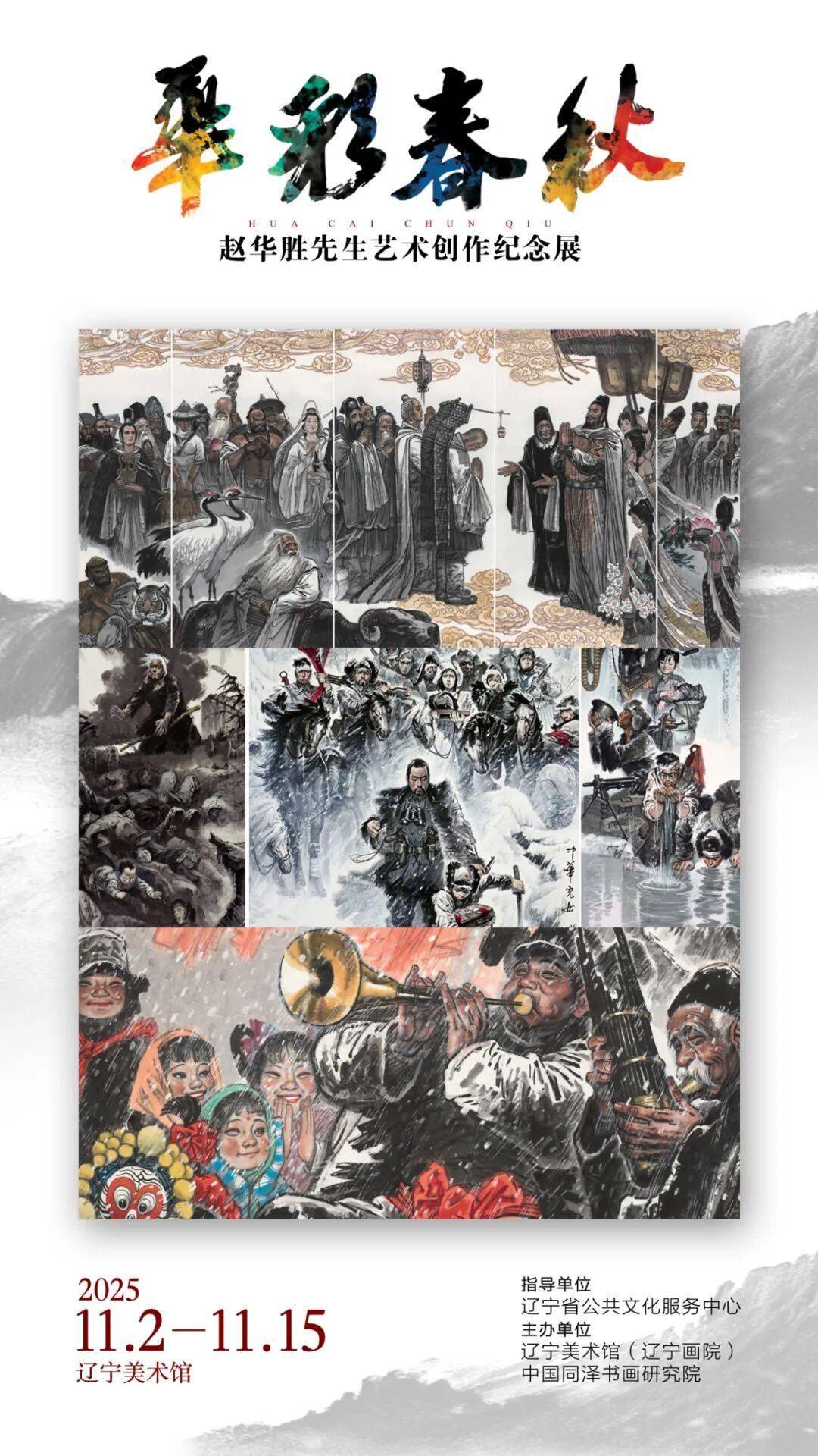 华彩春秋-赵华胜先生艺术创作纪念展,由辽宁省公共文化服务中心指导,辽宁美术馆(辽宁画院)、中国同泽书画研究院主办,沈阳正午文化策展设计。