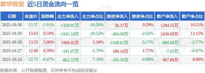 证券之星消息,截至2025年10月30日收盘,萃华珠宝(002731)报收于13.37元,下跌1.91%,换手率4.09%,成交量9.39万手,成交额1.26亿元。