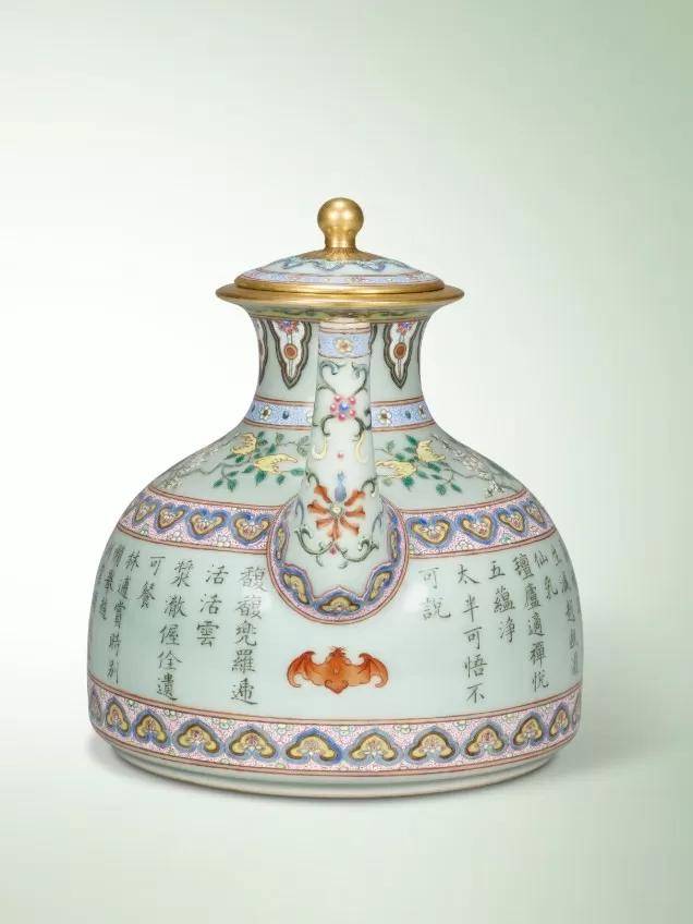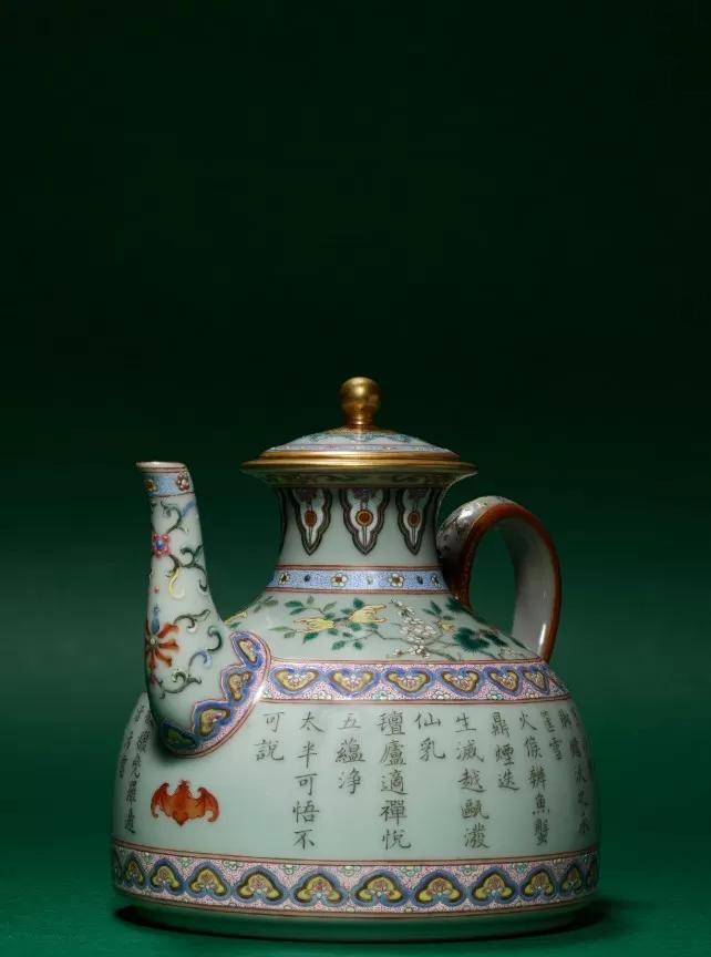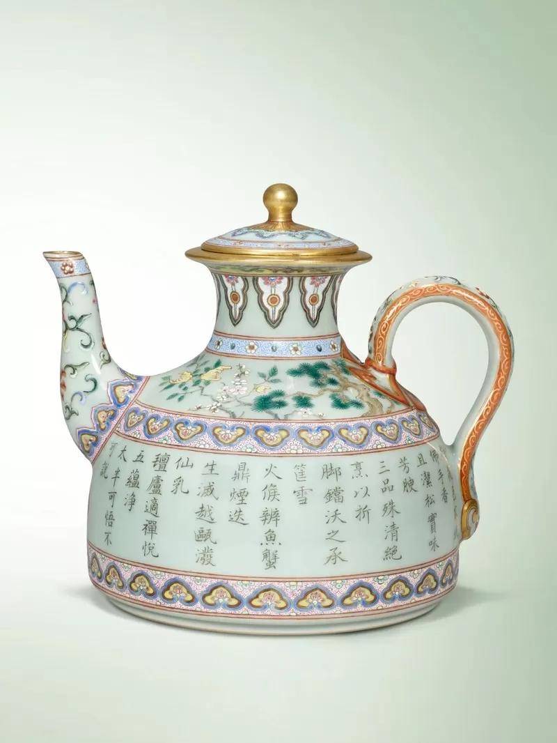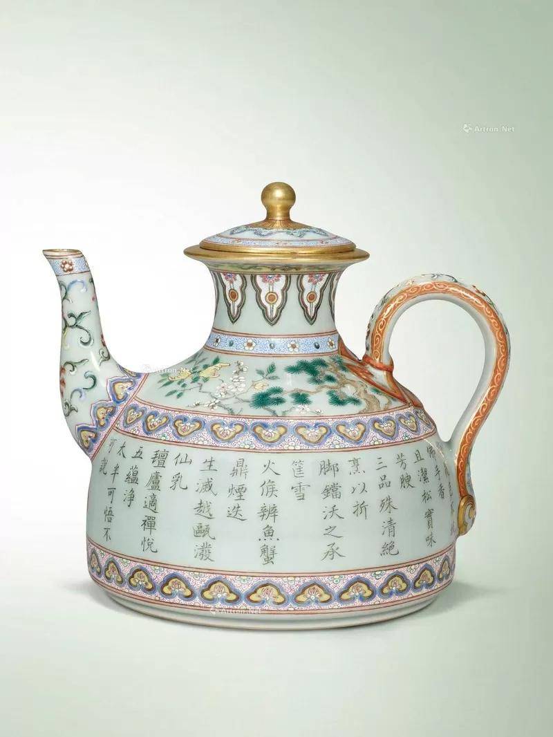 清乾隆 洋彩粉青地御题三清茶诗茶壶