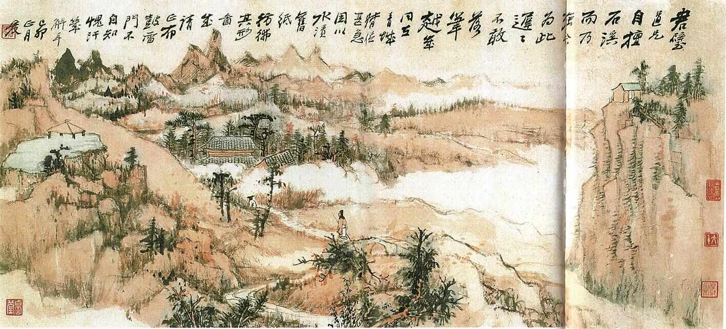 石溪的画作构图繁密,内含苍茫浑厚之气质,一般临摹者难以把握,而张大千却能准确把握石溪山水“厚实”“淋漓”“精细”的特点,将其模仿到出神入化的地步。然而,如果纯粹照搬照抄古画,在画坛上顶多是一位临摹高手,绝非书画大家。张大千能被称作20世纪的书画大家,是因为他不照抄原作,人云亦云,而是在画中加入空灵气韵与现代风格,将自己的绘画语言融入其中,让画作表现出浓厚的文人气息。在《拟二石山水前往深山行》一作中,张大千得二石之长,将石溪的苍茫之气、石涛的清逸之气巧妙融合。他的临摹作品,让我们看到不同时代、不同文化背景的山水画家间的交流。