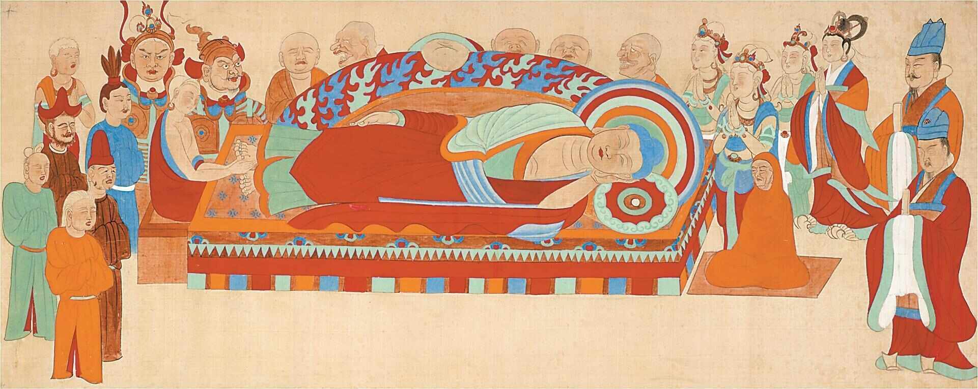 20世纪40年代是张大千艺术生成的黄金时期。张大千远赴西北,在敦煌开始了系统性的临摹工作。张大千在敦煌的临摹并非照搬,而是“摹古不泥古”,兼具原作神韵与个人创造力。在临摹中,他主要沿袭红色、青色、绿色,并衍生出咖啡色、深褐色的画风,通过色彩变化形成强烈的视觉冲击。以《释迦牟尼涅槃图》为例,张大千在造型上忠于原作,但在色彩上进行了再创造,将佛像安详、雍容的状态精准传递。