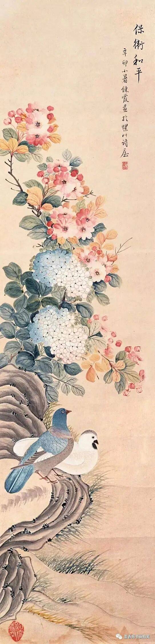 在这幅二人合作的《荷花鸳鸯》图轴中,吴湖帆用他从恽南田画风转化而来的吴装荷花点染出一片清凉绿荫,遮蔽着夏日的如火骄阳。而周炼霞则以其女性的柔情用宋人工笔精绘出一对五彩鸳鸯,在遮天的荷叶下相依相偎,怡然自得。抑或周氏把她和吴自比一对鸳侣,尽享着绿荫下的清凉世界。吴湖帆用精楷长题自作词一首,名为《五彩结同心》,更点明了吴周之间的一段情缘。