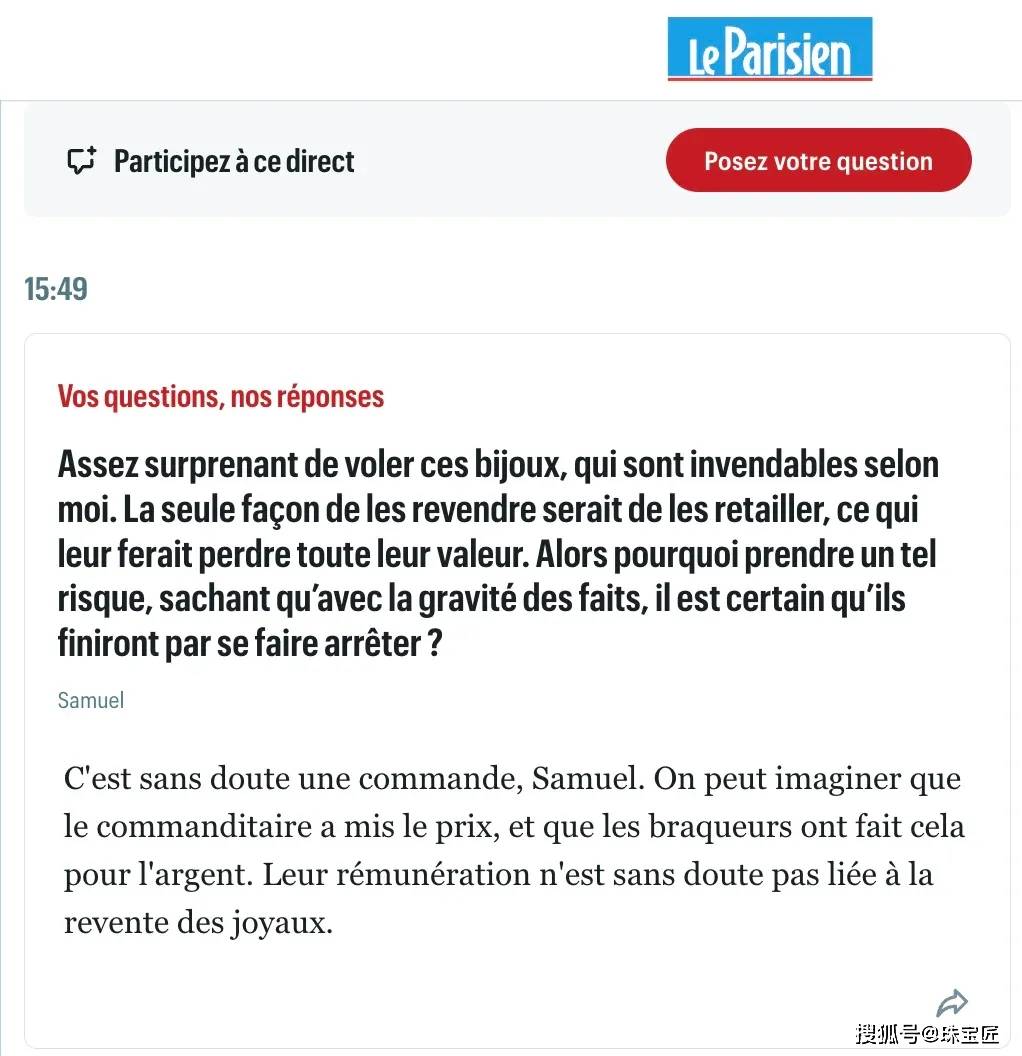上周发生的卢浮宫珠宝盗窃案,法国警察司法部资深记者,新闻事件专家让-米歇尔·德库吉在《巴黎人报》在线解答疑问时,有人提问:“这些珠宝这么知名,几乎卖不出去,为什么劫匪要冒这么大风险?”