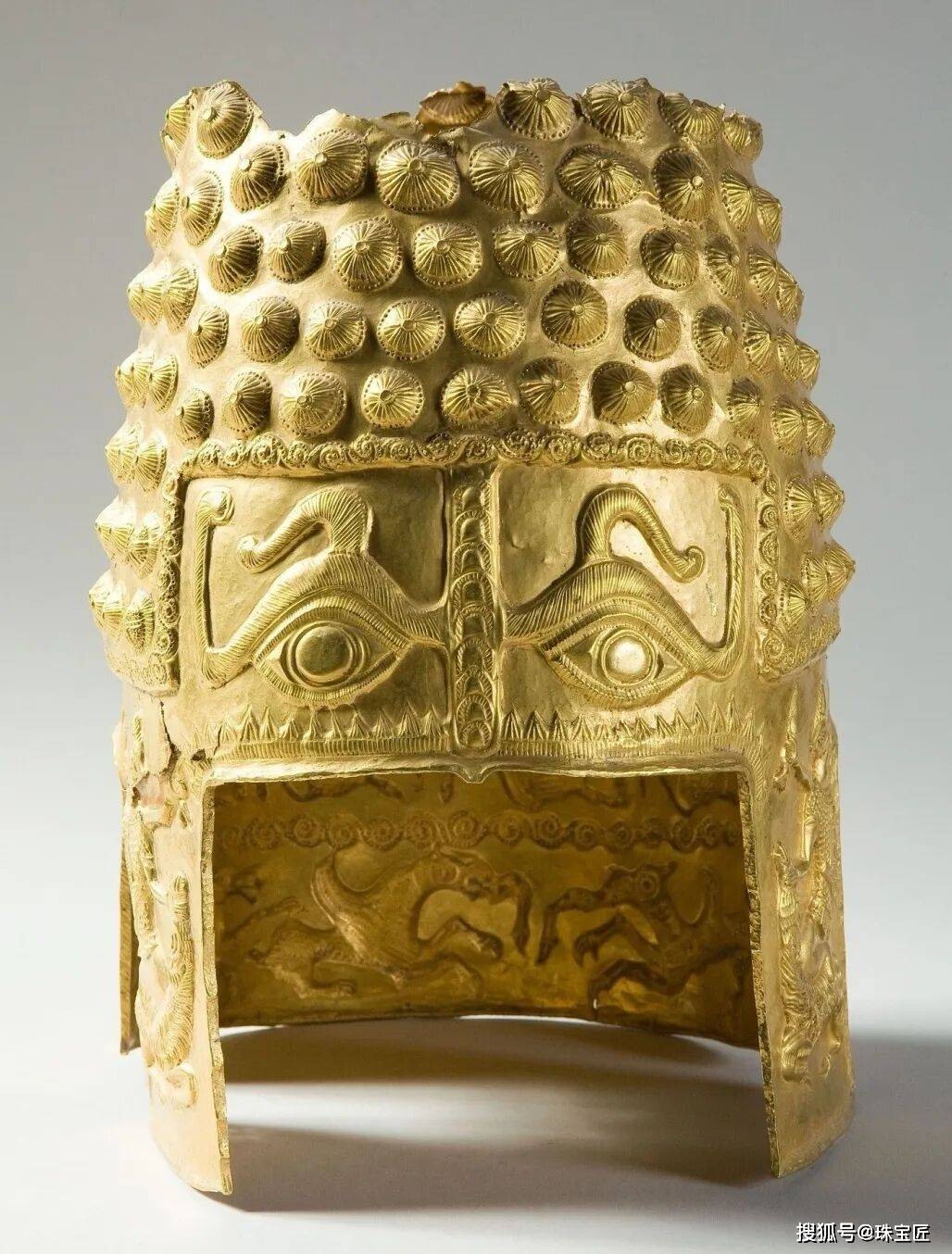 头盔顶部饰有乳钉纹样,前额部刻有一双眼睛,有抵御邪恶力量之意。头盔下部饰有一周神话人物形象,两侧护颊描绘祭祀仪式场景,据专家推测,应该被祭祀活动中,估价约为430万欧元。