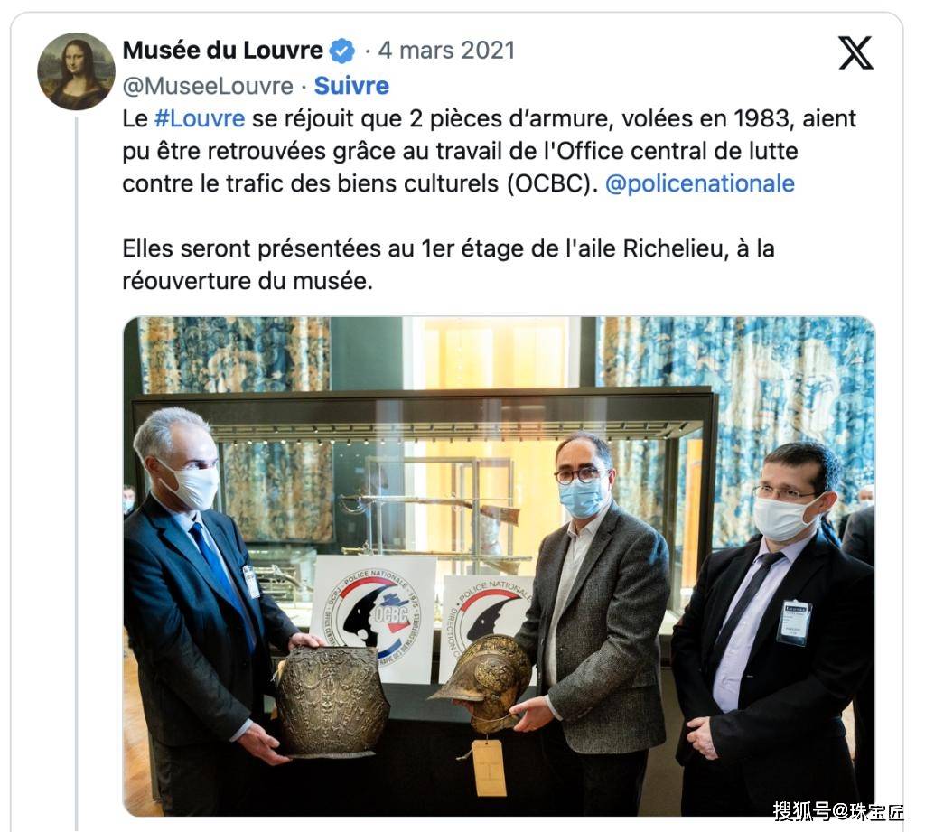 卢浮宫官方社交媒体上对失而复得的盔甲的报道
