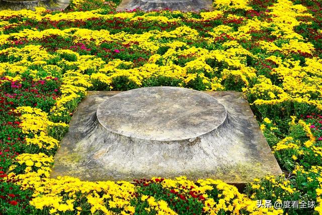 沿着小径往前走,便到了万佛楼遗址,这里曾是清代皇家祭祀祈福的重要场所,如今,数十盆造型别致的艺菊被巧妙地布置在遗址的石柱之间 —— 有的被修剪成 “盘龙” 造型,金黄的花瓣层层叠叠,仿佛巨龙盘旋;有的被培育成 “花篮” 模样,粉色与白色的菊花相互映衬,悬挂在古色古香的木架上,既有历史的厚重感,又不失花卉的灵动。