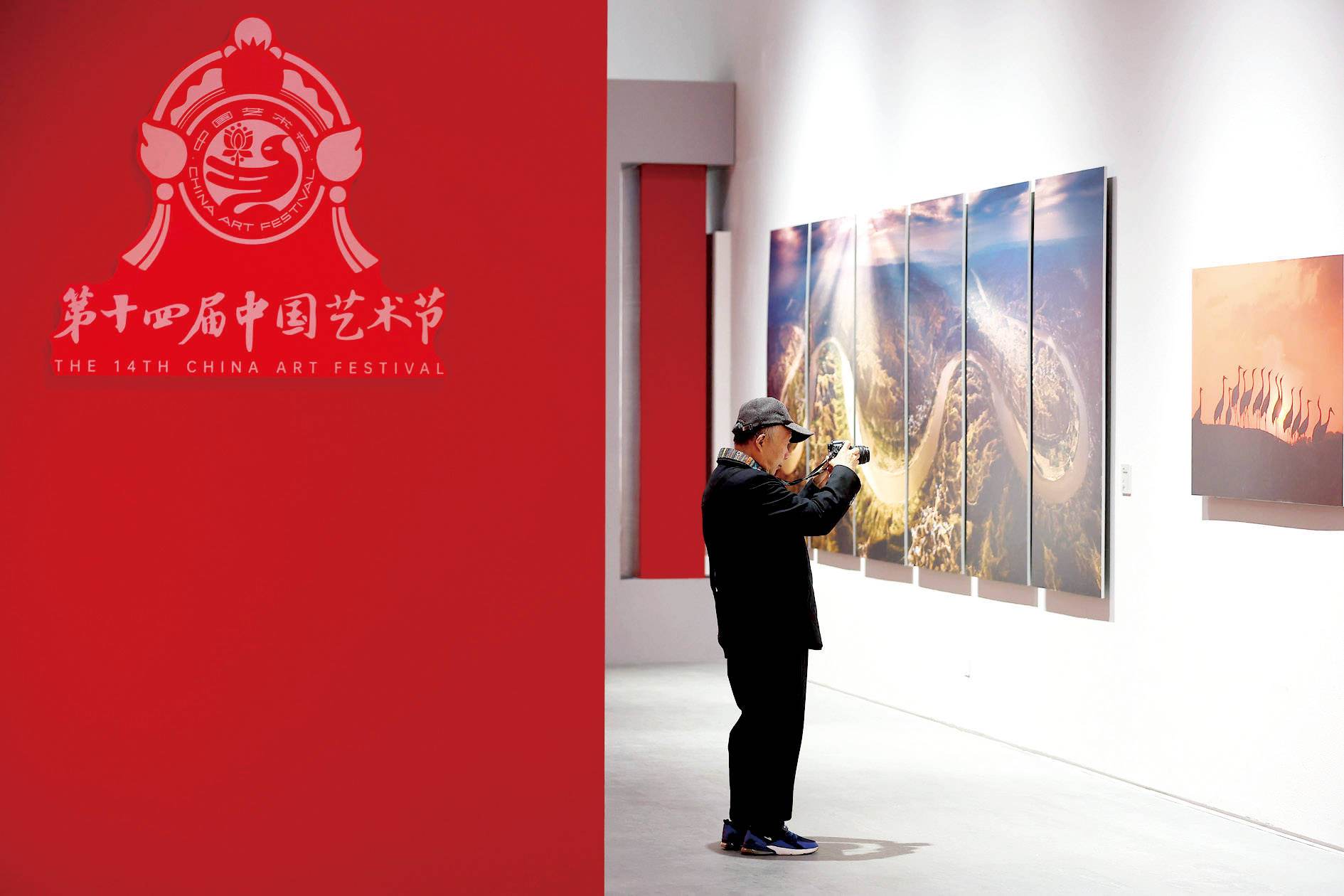 在四川美术馆,第十四届中国艺术节全国优秀摄影作品展览吸引参观者。