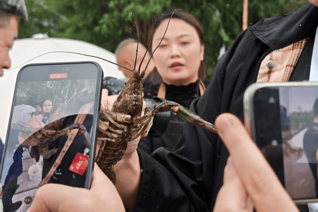 游客在田间钓起澳洲淡水蓝龙虾(央广网发 邹巧 摄)