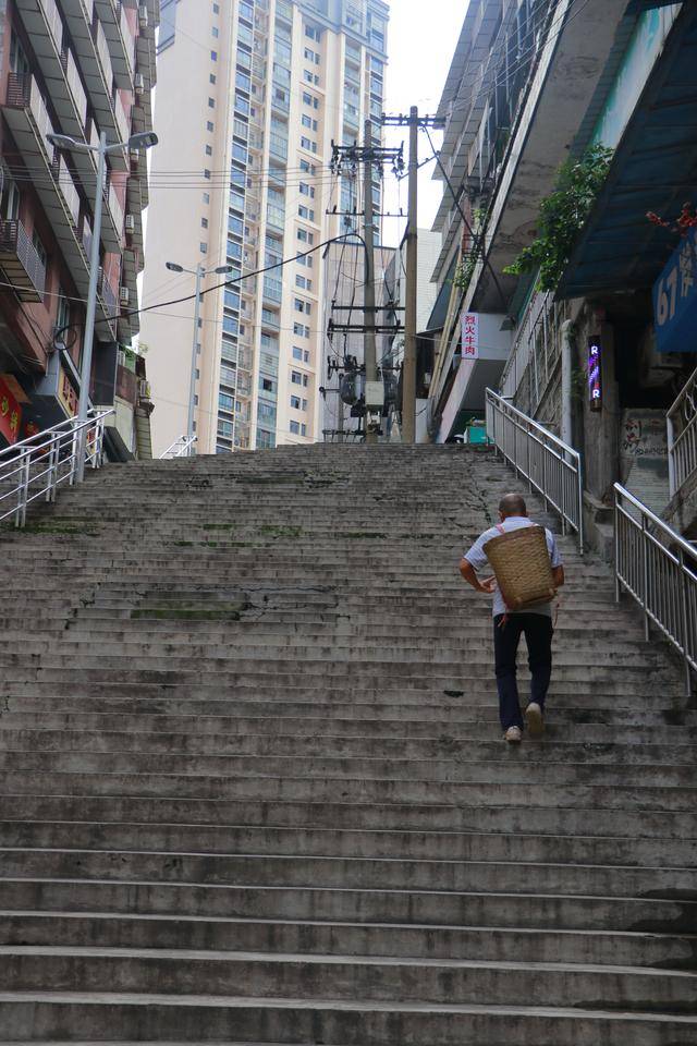 日常的负重劳作并未完全退场。梯坎上,常能遇见一位背篓大爷。他使用的仍是传统的竹编大背篓,里面装满了自采或收购的金银花、车前草等中药材,背到街市售卖。他一边照顾在附近七中上学的孩子,一边靠着卖中药贴补家用。“多爬楼梯对身体好,背一大篓天天爬也不觉得累,爬习惯了。”对于这份旁人看来辛苦的攀爬,大爷有着自己的理解:“就是经常锻炼,跟早晨人家锻炼身体一回事。天天爬就没得事,要是突然不爬了再去爬,那才恼火。”他佝偻却稳健的身影,以及那承载着重物的竹背篓,仿佛历史图景在现代梯坎上的一个微小却坚韧的投影。