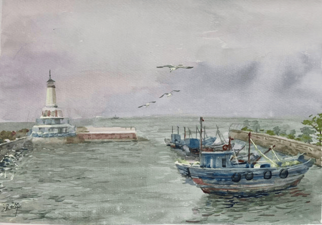 活动当日天气从阴天逐步转为小雨,虽无阳光映照下的明快景致,却为海边码头赋予了独特的朦胧美感——灰调天空下的渔船轮廓更显质朴,湿润空气让海面泛起细碎雾感,岸边礁石与缆绳的纹理在阴雨天光中更具细节层次,反而为写生创作提供了“非常规”的艺术灵感。面对天气变化,参与者们未受影响:阴天时专注捕捉码头的静谧氛围,小雨零星洒落时便撑起伞,继续俯身调色;指导老师们则结合天气特点实时调整指导重点,如阴天光线柔和,可通过加强近景笔触对比突出画面层次;空气湿润,更容易表现码头的氤氲水汽;帮助参与者将天气因素转化为作品的艺术特色。