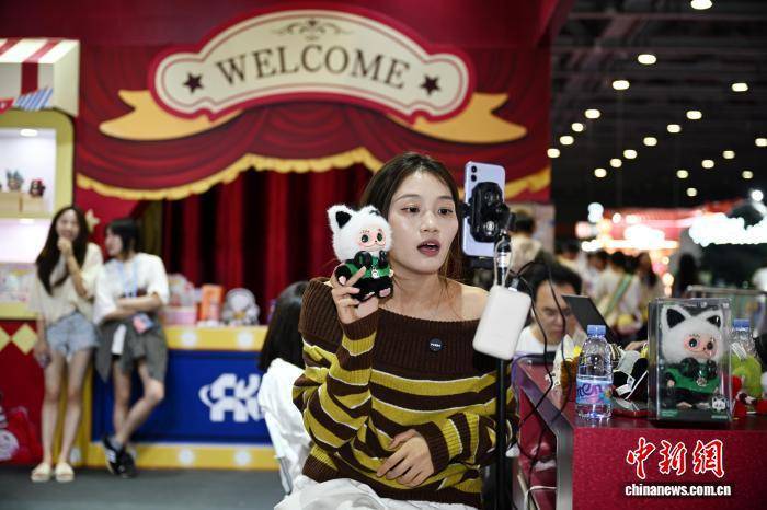 10月31日,SAT潮流艺术展在位于广州市的保利世贸博览馆开幕。本次展会以“潮玩共生,艺术无界”为主题,来自全球的450余家潮玩品牌与艺术家齐聚于此,携超过2000款限定新品亮相。图为工作人员直播介绍毛绒玩具。中新社记者 陈楚红 摄