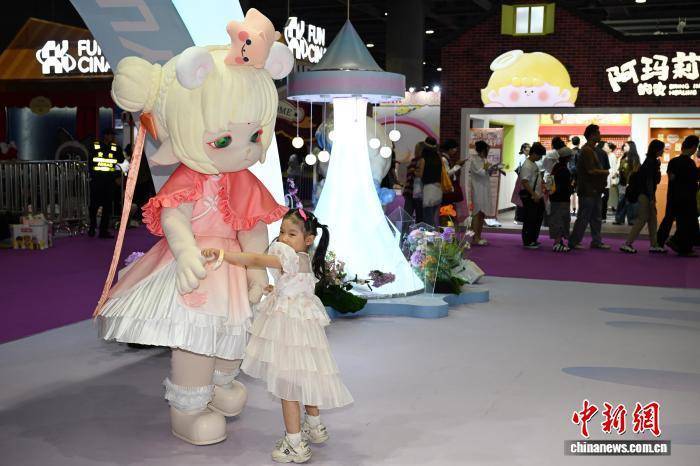 10月31日,SAT潮流艺术展在位于广州市的保利世贸博览馆开幕。本次展会以“潮玩共生,艺术无界”为主题,来自全球的450余家潮玩品牌与艺术家齐聚于此,携超过2000款限定新品亮相。图为一名小朋友和动漫扮演者拥抱。中新社记者 陈楚红 摄