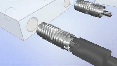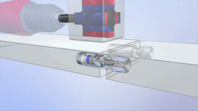 然后将磁性旋转器安装在电钻上,并将其放置主体螺丝上方平行的地方。隐形螺丝内部存在一块磁铁,控制器内部也内置了一块磁铁,在外部磁场的作用下,主体螺丝跟随钻头快速旋转直至紧固。就这样,螺钉主体和螺母并拧在了一起。