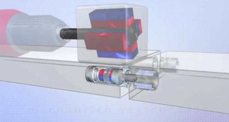 听起来像是天方夜谭,但是瑞士一家公司就已经将这种螺钉发明出来了。拉米诺公司一家专营进口木工机械设备及五金连接件的公司,这家公司就成功的研发出了隐形磁性螺钉Invis Mx ,可以在外部通过磁力将隐藏在内部螺钉拧紧。