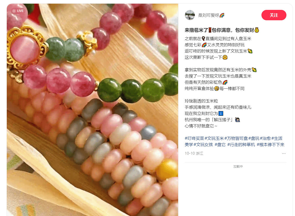 文玩玉米的走红与年轻人“万物皆可盘”有关,即通过长期使用、摩挲,物品带上个人痕迹,成为一种解压、悦己的生活方式。但不是所有玉米都能盘,日常吃的甜玉米、糯玉米水分大、颗粒软,把玩时容易发霉、掉粒。
