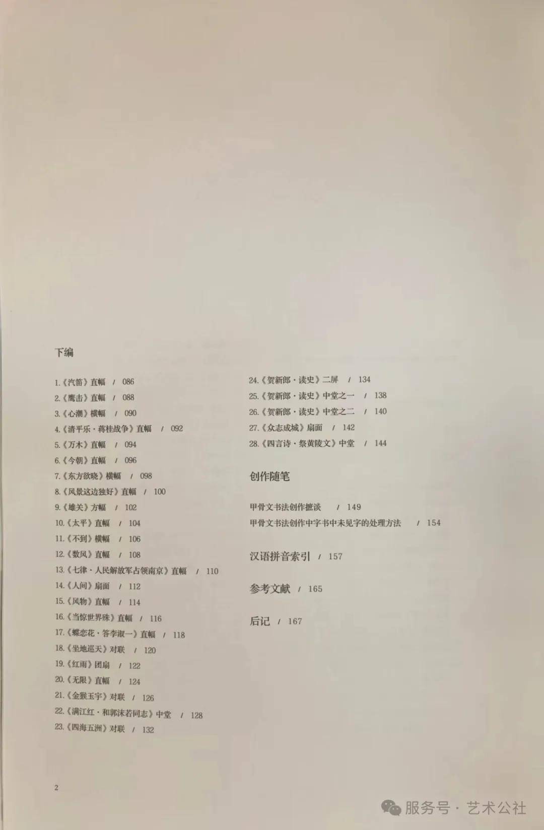 此作品集收录了张晓东先生用甲骨文书写的毛主席诗词作品共68幅,后附创作随笔两篇和通假字等汉语拼音索引。我虽然对书法属于外行,但还是能从其作品中得到艺术享受。张晓东先生用甲骨文书写毛泽东诗词的作品,首先是字形书写准确,字形都来自目前代表学界最新成果的工具书;其次是甲骨文没有的字采用通假和借用的方法,这些通假和借用大都符合文字结构理据。甲骨文因字头数少,在书法创作时很受限制,面对这一困境,书法界一向有两种态度和抉择:一种是坚持用甲骨文已有的字形书写,拒绝用通假和借用的方法;一种是抱着通达的态度,在遇到甲骨文没有的字时,采用通假或借用的方法。我是赞同后一种态度和抉择的,因为首先通假是中国早期文字书写时常用的手段,在甲骨文中就时常使用,我们后世书写甲骨文偶尔采用通假的方法,其实是延用古人的习惯,是符合文字书写规律的;其次是如果甲骨文没有的字,利用后世譬如金文的形体以甲骨文的笔意写出,当然也是可行的。总之我认为在这个问题上宜抱着通达的态度,手段要服从目的,不能胶柱鼓瑟,否则利用甲骨文进行创作就会缩手缩脚,左右支绌。关于利用甲骨文进行创作时采用通假或借用的方法,张晓东先生有自己的一些独到见解,在书后所附《甲骨文书法创作中字书中未见字的处理方法》一文中有充分的论述,读者可以参看。
