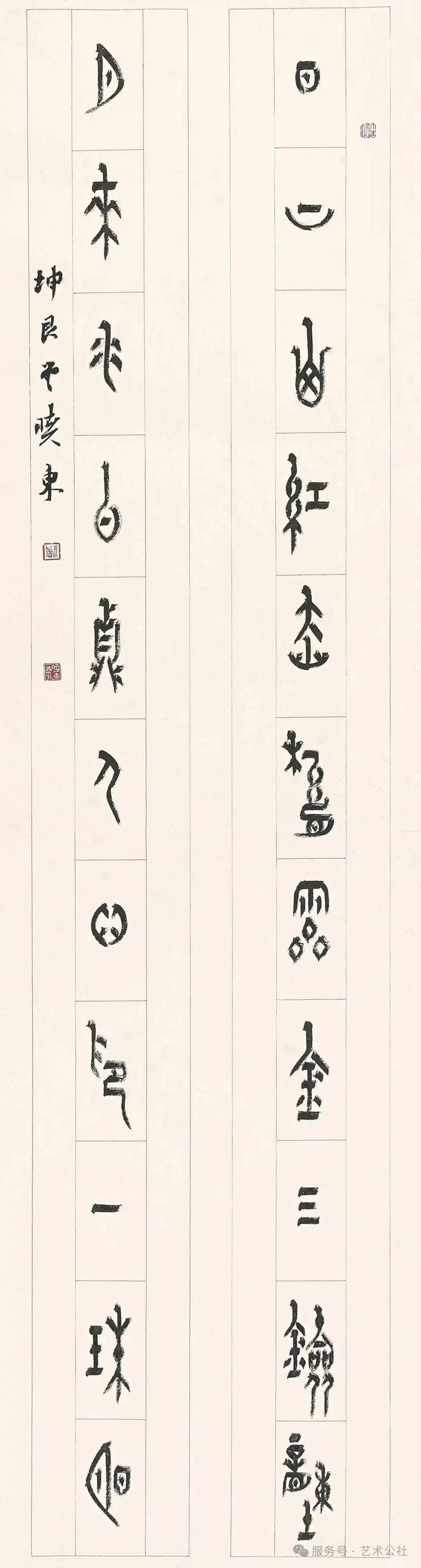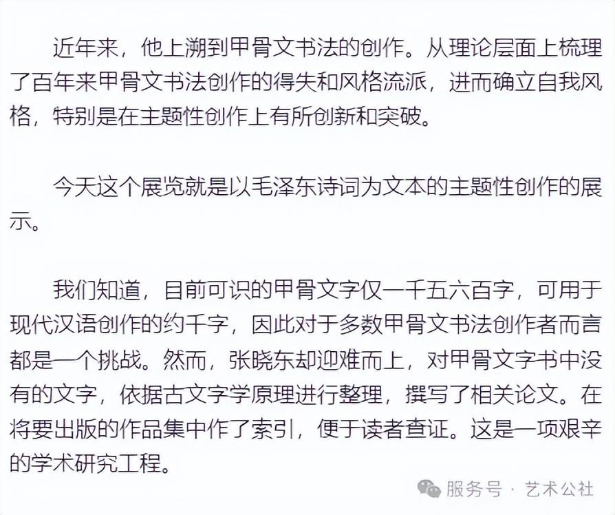 张晓东先生出生于内蒙古,生就豪放的性格,但书法创作中却能将豪放与细腻加以充分结合,粗中有细,刚挺中不乏婉约。这次利用甲骨文书写毛主席诗词,可以说是他艺术创作道路上一个重要的标志,也是一个重要的时间节点。相信他一定能够在此标志和时间节点上重新出发,而今迈步从头越,砥砺奋发,越走越远,再创辉煌。