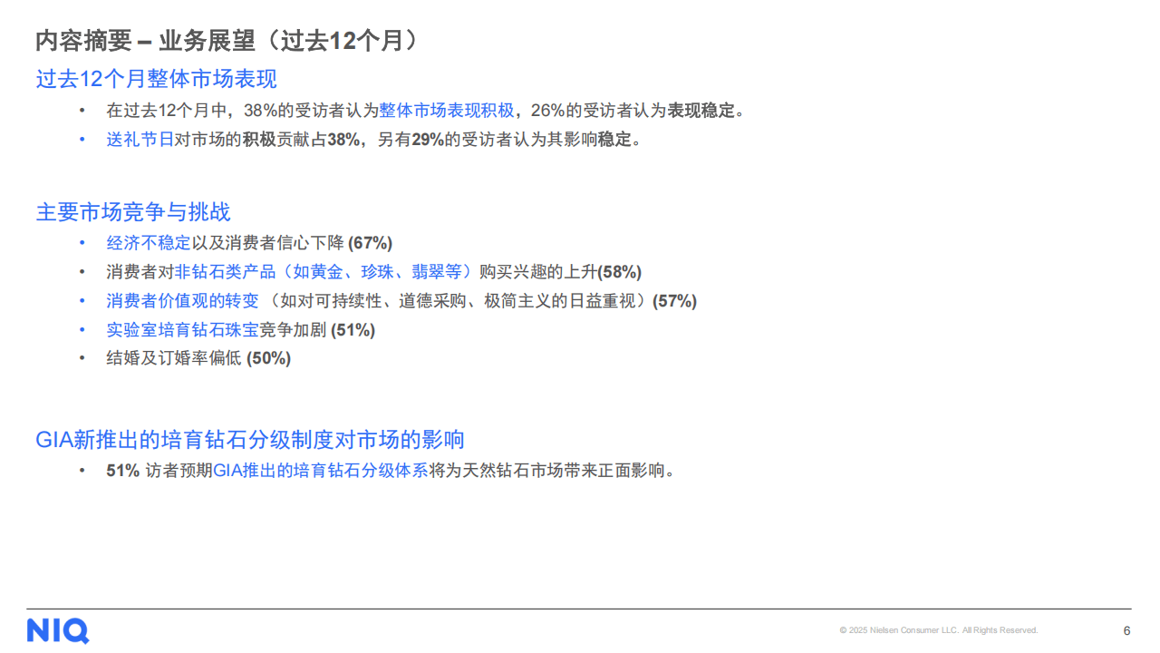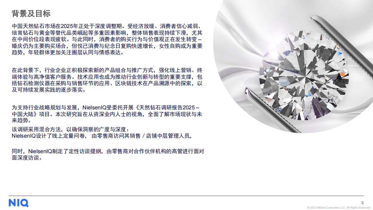 2025年,中国天然钻石市场正经历深度调整期。受经济环境、消费观念变化及替代品类竞争等多重因素影响,市场整体销售虽面临压力,但也在转型中呈现新的消费趋势与行业机遇。近日,NielsenIQ(NIQ)发布的《2025天然钻石调研报告——中国大陆》,从市场表现、消费者行为、科技应用及未来展望等维度,勾勒出当前天然钻石行业的真实图景,为大众揭示这一传统珠宝品类的新动态。