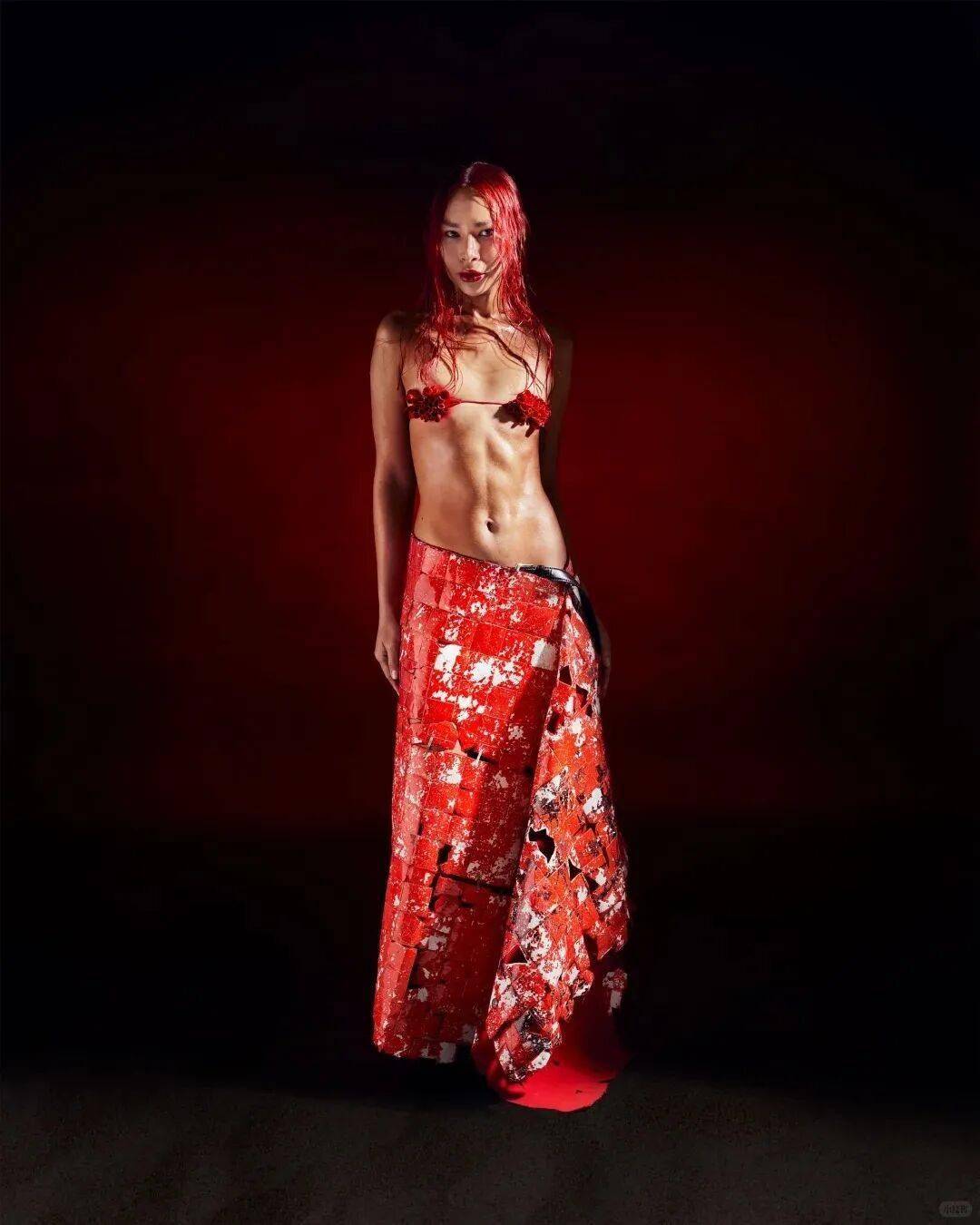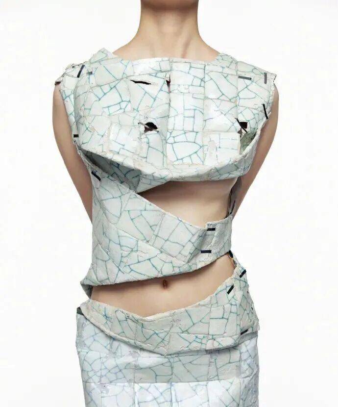 这一工艺不仅解决了陶瓷的穿着难题,更赋予服装雕塑般的质感。景德镇高岭土的冷艳色泽与针织的肌理交织,使服装在光影下透出玉器般的温润,行走时如水波流动,静立时则凝固为当代艺术。
