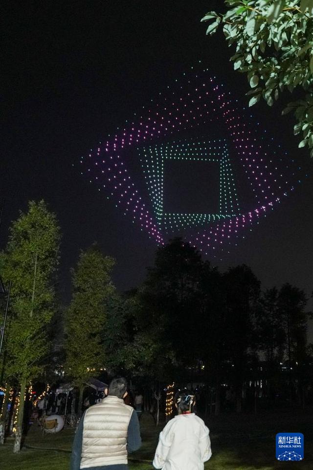 11月1日晚,2025中国公路自行车公开赛(眉山彭山站)开赛前夜,一场无人机表演点亮四川省眉山市彭山区的夜空,当地群众在非遗市集和主题音乐会等多元文化活动中享受惬意的周末时光。