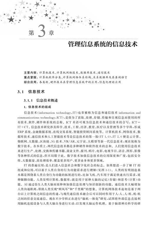 发展应用篇(第13~15章): 人工智能与网络学习、大模型原理及应用、管理信息系统应用与研究。顺应最新发展需求,本教材及时补充了人工智能和大模型方面的内容,包括人工智能、神经网络和大语言模型的发展历史、概念、学习方法和平台等; 保持与应用场景的紧密联系,保留决策支持系统,增加了供应链系统、电子商务和电子政务、商务智能和数字经济等内容。