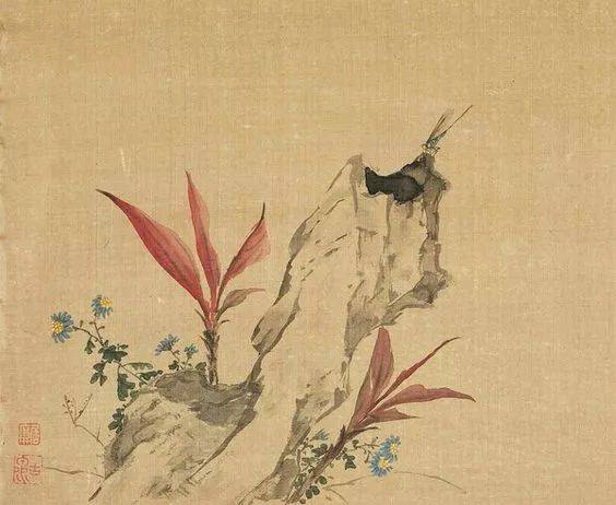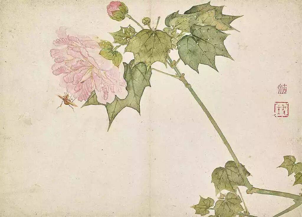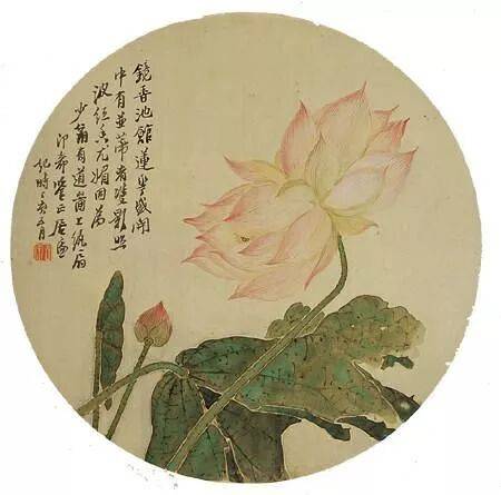 为什么叫做没骨法,就是不用墨笔勾勒,祗用颜色来点戮,这就叫作没骨。这画法创始于北宋徐崇嗣,花卉是以清姘艳丽为主,完全拿颜色来表现,是较为容易的。这法传到清初,要算恽南田第一,清姘艳丽四个字,可以说是阐发无馀了。画花瓣尽可全用颜色,也不妨先用水墨点戮,然后略施浅色,觉得更有精神些。白阳石涛是常用这方法的,荷花颇适合于没骨。先用浅红色组成花形,再用嫩黄画瓣内的莲蓬,跟看即添荷叶荷干,叶是先用大笔蘸淡花青扫出大体,等色干后,再用汁绿层层渲染,在筋络的空间,要留一道水绿。荷干在画中最为重要,等于房予的梁柱,画时从上而下,好像写大篆一般。要顿挫而有势,有亭亭玉立的风致。如果画大幅,干太长了,不可能一笔画下,那么下边的一段,就由下冲上,墨之干湿正巧相接,了无痕迹。干上打点,要上下相错,左右揖让,笔点落时,略向上踢。花瓣用较深的臙脂,再渲染一二次,再勾细线条,一曲一直,相间成纹;花须用粉黄或赭石都可。这时看画的重心所在。加上几笔水草,正如书法所说的「疏可走马,密不透风」也。