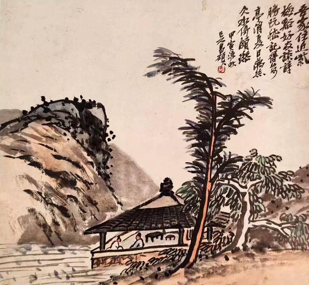 款识:吾家住近紫梅溪,好友谈诗胜阮嵇。记得荷亭消夏日,藕丝冰水倚颇。甲寅凉秋,吴昌硕。