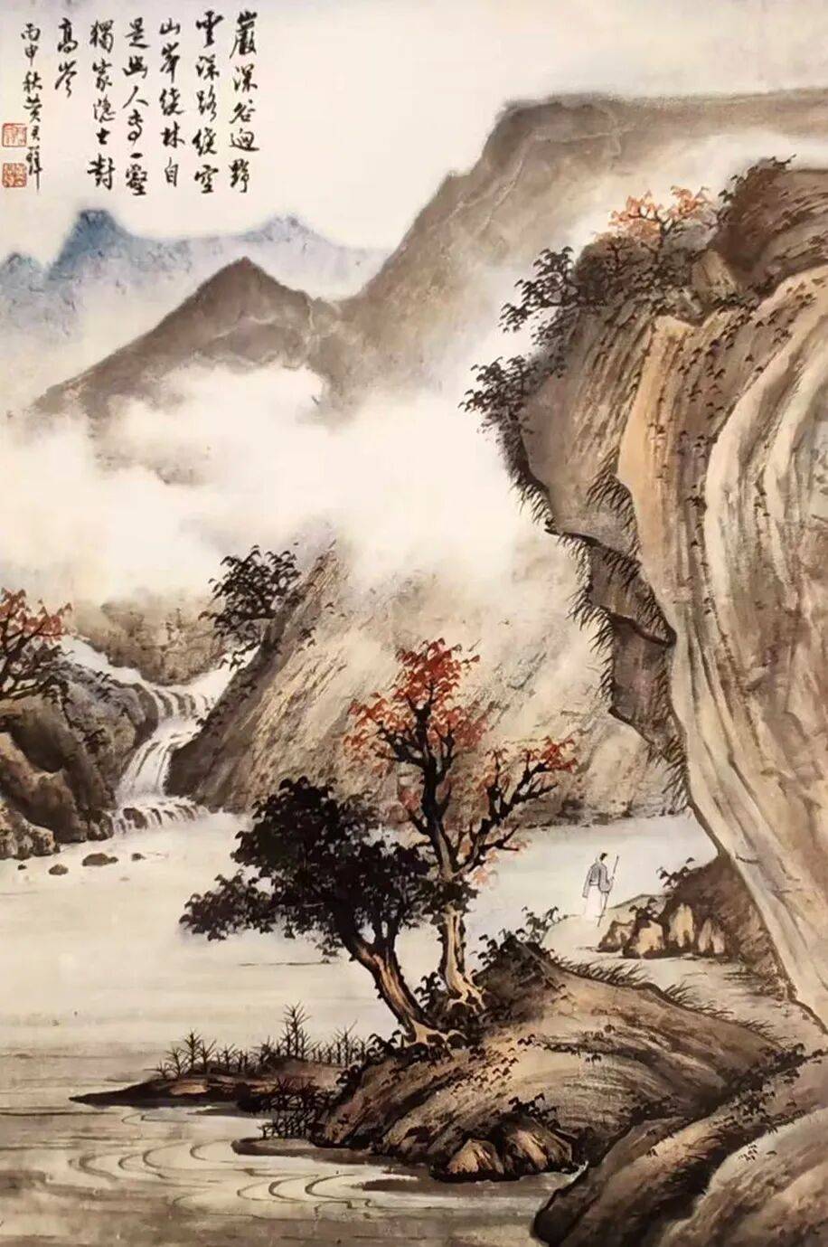 款识:岩深谷迥野云深,路绕空山峰绕林。自是幽人专一壑,独家隐士对高岑。丙申秋,黄君璧。