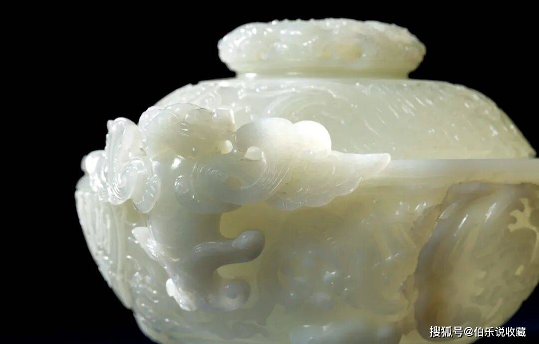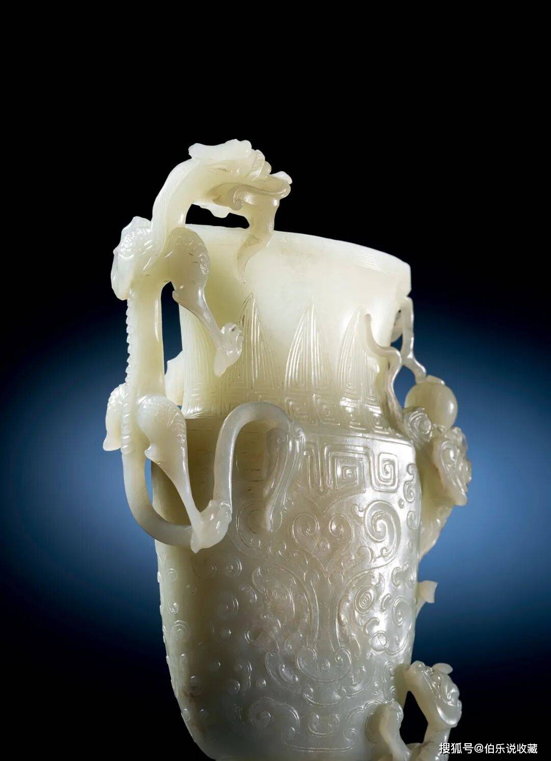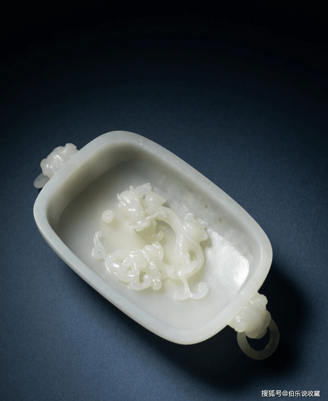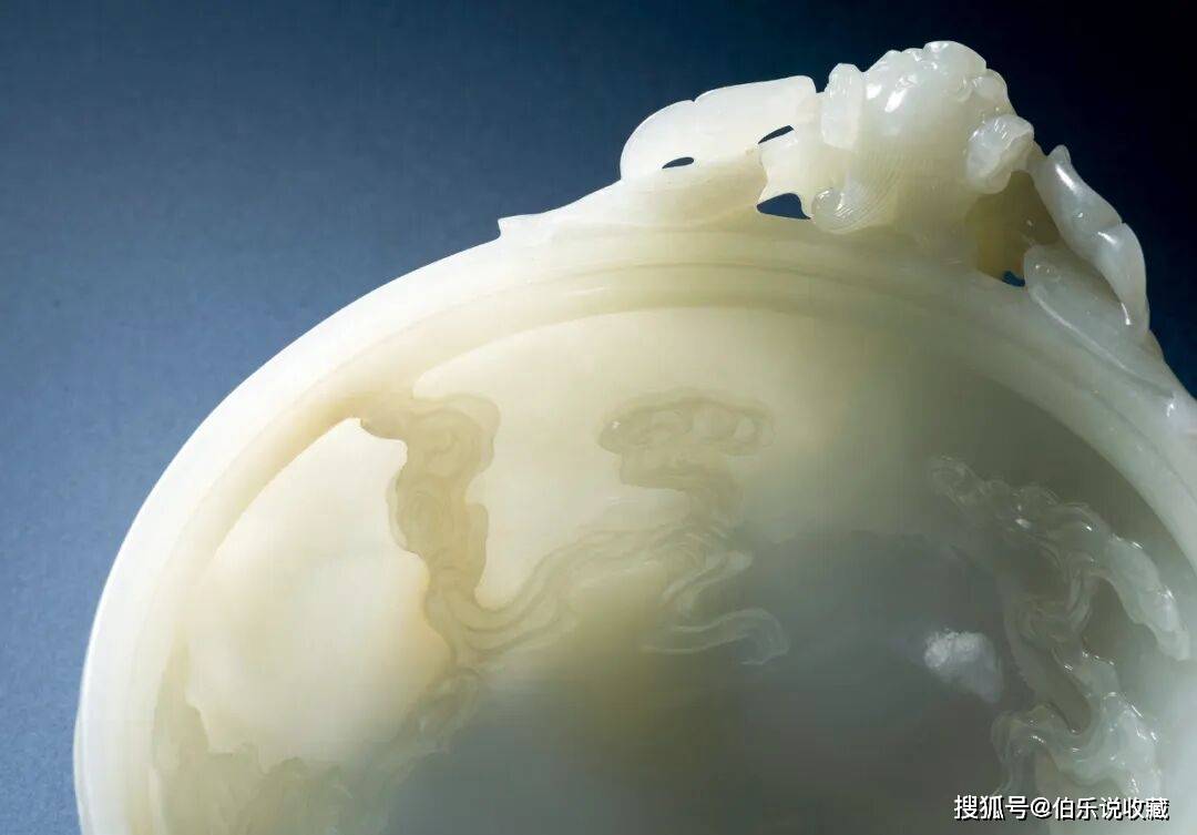 乾隆玉器除了玉山子、玉插屏外,尤以仿青铜器和仿痕玉为代表。乾隆皇帝好古而精鉴,常以诗文评点时作,曾借“玉卮”之喻,慨叹良玉为俗工所误。为匡正时俗,重振古雅,敕令工匠以《西清古鉴》及清宫旧藏青铜器、古玉为范本治玉,所成器物既存玉质温润又得古器典雅。白玉雕苍龙教子洗即为此理念下的艺术结晶。