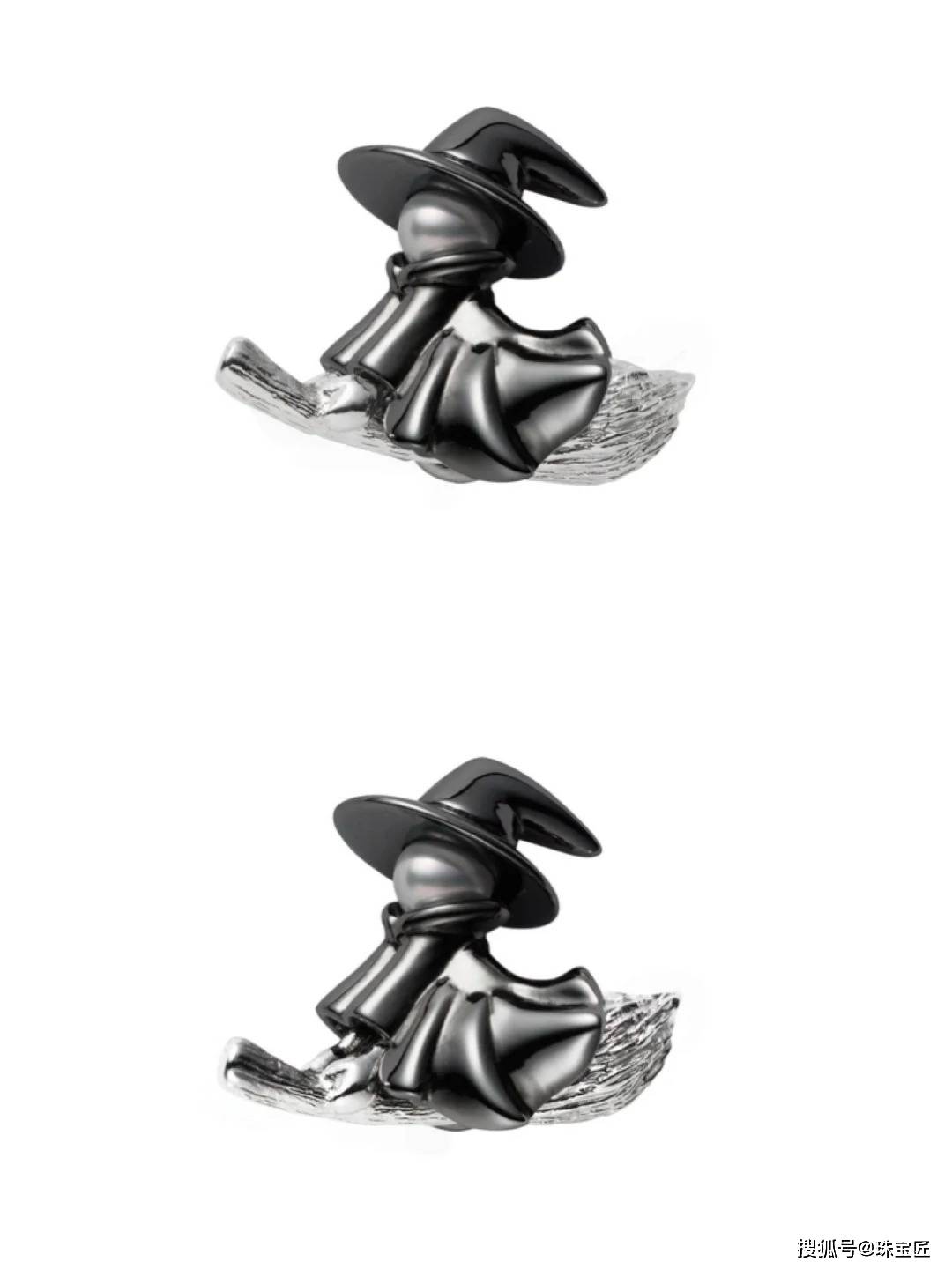 这款 “飞天女巫” 胸针,更是将万圣节的灵动趣味藏进了珠宝细节里。造型定格女巫骑着扫帚腾空的瞬间,衣摆弧度、扫帚纹理都用细腻金工勾勒,生动活泼。