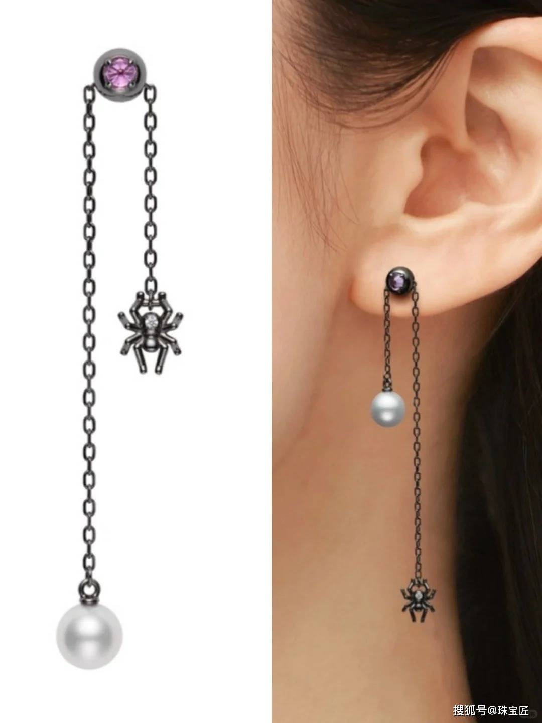 另一款蜘蛛耳坠更是心机满满。细细的镀黑链条垂下来,一边挂着blingbling的镶钻小蜘蛛,另一边坠着经典的Akoya珍珠,这个反差感简直绝了。