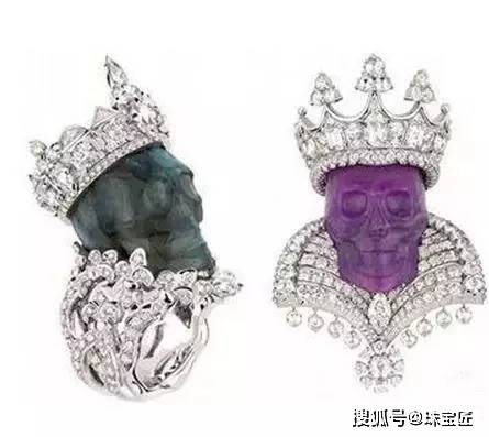 该系列包含 10 位 “国王” 与 10 位 “王后” 主题作品,采用猫眼石、石英、黑曜石等稀有宝石雕刻成骷髅头造型,再搭配钻石、铂金打造王冠、耳饰、项链等配饰。