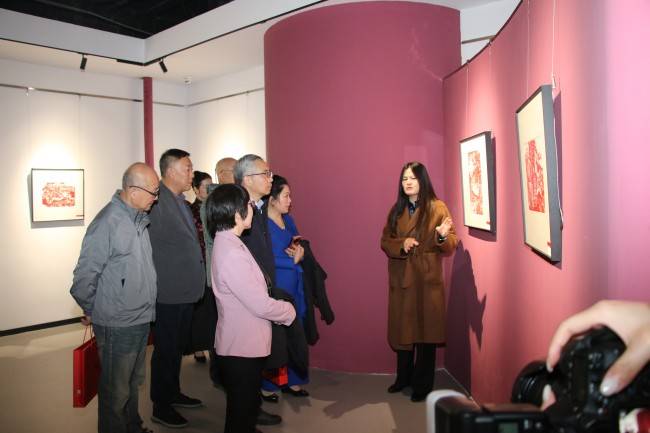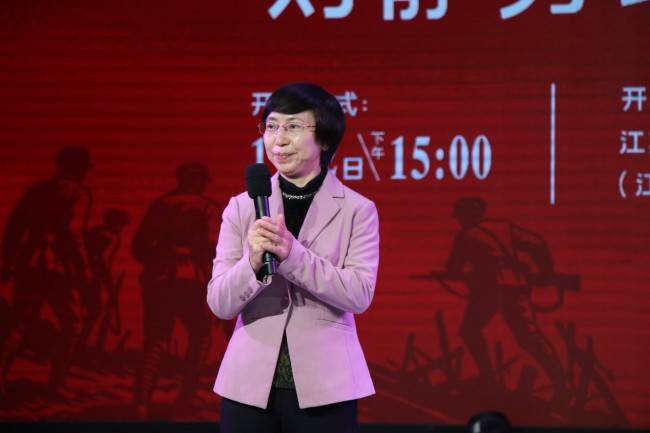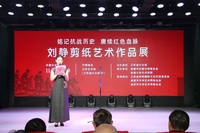 开幕式上,主持人博今今首先介绍了莅临现场的嘉宾,并宣读江苏省文化馆赵彦国馆长的贺信。赵馆长在贺信中说:“剪纸艺术作为我国普及率极高的民间艺术,是劳动人民智慧的结晶,其‘镂空之美’承载着浓厚的生活情怀与文化底蕴。刘静女士的作品兼具传统技艺坚守与时代精神表达,以‘铭记抗战历史,赓续红色血脉’为主题,用剪纸这一独特形式讲述宏大历史,让观众在感受艺术魅力的同时,重温红色记忆,意义深远。”