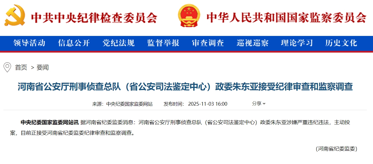 据河南省纪委监委消息:河南省公安厅刑事侦查总队(省公安司法鉴定中心)政委朱东亚涉嫌严重违纪违法,主动投案,目前正接受河南省纪委监委纪律审查和监察调查。