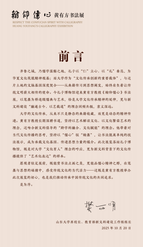 据了解,孔子博物馆是社会科学类名人专题的国家一级博物馆。作为弘扬儒家文化的重要阵地,孔子博物馆近年来持续推动传统文化与当代艺术的对话。本次展览不仅是黄有方教授个人艺术成果的集中展示,也是博物馆践行“文化自信”、推动中华优秀传统文化创造性转化与创新性发展的重要举措。