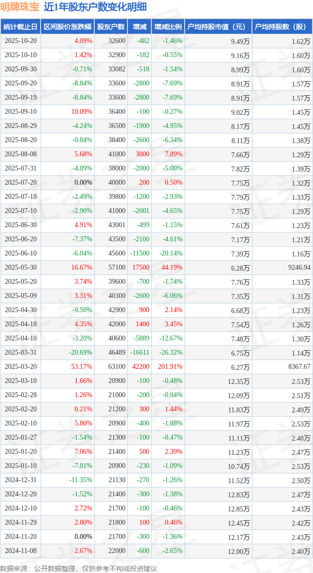 从股价来看,2025年9月30日至2025年10月20日,明牌珠宝区间涨幅为4.09%,在此期间股东户数减少482.0户,减幅为1.46%。