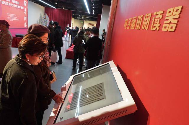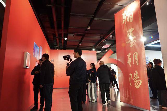 观展活动现场,参会嘉宾纷纷在电子互动寄语装置上打卡、在电子屏幕上书写寄语,并同步显示在旁边的显示屏上,留下珍贵影像。现场装置还设计了电子画册阅读屏,部分获奖作者与朝阳区书法爱好者共同参与体验,并进行现场交流。